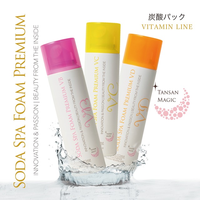 ※通常注文を同時にされる場合は、別送となりそれぞれ送料がかかりますのでご注意くださいませ。 <炭酸パック> (3種類のセット販売です) ○ソーダスパフォーム プレミアムVB 1本 ○ソーダスパフォーム プレミアムVC 1本 ○ソーダスパフォーム プレミアムVD 1本 容量:各150g 価格:9,900円(税抜価格9,000円、消費税900円) 【ご使用方法】 ーー お顔や全身 ーー 1.メイクは落とした状態でお使い下さい。 適量(直径約5cm)を手に取り、乾いたお肌にのせていきます。 2.泡をクッションにして、顔の中心から外側へとやさしくマッサージするように塗布します。 3.泡が全体に行き渡ったら、5分程度パックし、十分に洗い流します。 ーー 髪や頭皮 ーー 1.乾いた髪、またはシャンプー後のタオルドライした状態にもお使い頂けます。 適量を髪全体に塗布し、頭皮にもなじませます。 2.泡をクッションにして、指の腹でやさしく頭皮をマッサージします。髪の先まで泡が付いていることを確認します。 3.泡が全体に行き渡ったら、5分程度パックし、十分に洗い流します。 <ソーダスパフォーム プレミアムVB> 【成分情報】水、BG、グリセリン、ジグリセリン、LPG、PEG-25フィトスタノール、ステアリン酸、セテアリルアルコール、ベヘン酸、TEA、ベヘニルアルコール、二酸化炭素、PEG-150、フェノキシエタノール、香料、炭、ポリグリセリン-10、ミリスチン酸ポリグリセリル-10、ステアリン酸ポリグリセリル-10、温泉水、デヒドロ酢酸Na、クエン酸、シアノコバラミン、赤102 <ソーダスパフォーム プレミアムVC> 【成分情報】水、BG、グリセリン、ジグリセリン、LPG、PEG-25フィトスタノール、ステアリン酸、セテアリルアルコール、ベヘン酸、TEA、ベヘニルアルコール、二酸化炭素、温泉水、ユビキノン、リン酸アスコルビルMg、PEG-150、フェノキシエタノール、香料、黄203 <ソーダスパフォーム プレミアムVD> 【成分情報】水、BG、グリセリン、ジグリセリン、LPG、PEG-25フィトスタノール、ステアリン酸、セテアリルアルコール、ベヘン酸、TEA、ベヘニルアルコール、二酸化炭素、温泉水、ヘマトコッカスプルビアリスエキス、エルゴカルシフェロール、酢酸トコフェロール、トリ(カプリル酸/カプリン酸)グリセリル、PEG-150、フェノキシエタノール、香料、橙205 【使用上の注意事項】 お肌に合わない場合、お肌に異常がある場合は使用を中止してください。 初めてお使いになる方はパッチテストをおこなってください。 肌に違和感を感じた場合は、すぐに洗い流してください。 お肌に異常が生じていないかよく注意して使用してください。 目に入らないように注意し、入った場合はすぐに洗い流してください。 使用後は必ずしっかりキャップをしめてください。 乳幼児の手の届かないところに保管してください。 極端に高温又は低温の場所、直射日光のあたる場所には保管しないでください。 可燃性であるので、保管及び取り扱いにあたっては火気に十分注意してください。 よく振ってからご使用ください。振らずにご使用になると、最後まで使いきれないことがあります。 真っ直ぐ立ててご使用ください。 低温下では泡になりにくいので常温(20℃程度)に戻してお使いください。 高温下(40℃以上)に保管しないでください。泡にならないことがあります。 ファンヒーターなどの暖房器具や加熱源の周囲は温度が上がり破裂する危険があるので置かないでください。 捨てるときは、火気のない屋外で噴射音が消えるまでボタンを押しガスを抜いてください。中身がなくなるまで使い切ってください。 火気と高温に注意 高圧ガスを使用した可燃性の製品であり、危険なため、下記の注意を守ること。 (1)炎や火気の近くで使用しないこと。 (2)火気を使用している室内で大量に使用しないこと。 (3)高温にすると破裂の危険があるため、直射日光の当たる所や火気等の近くなど温度が40度以上となる所に置かないこと。 (4)火の中に入れないこと。 (5)使い切って捨てること。 高圧ガス:LPG、炭酸ガス エアゾール製品 原産国:日本製