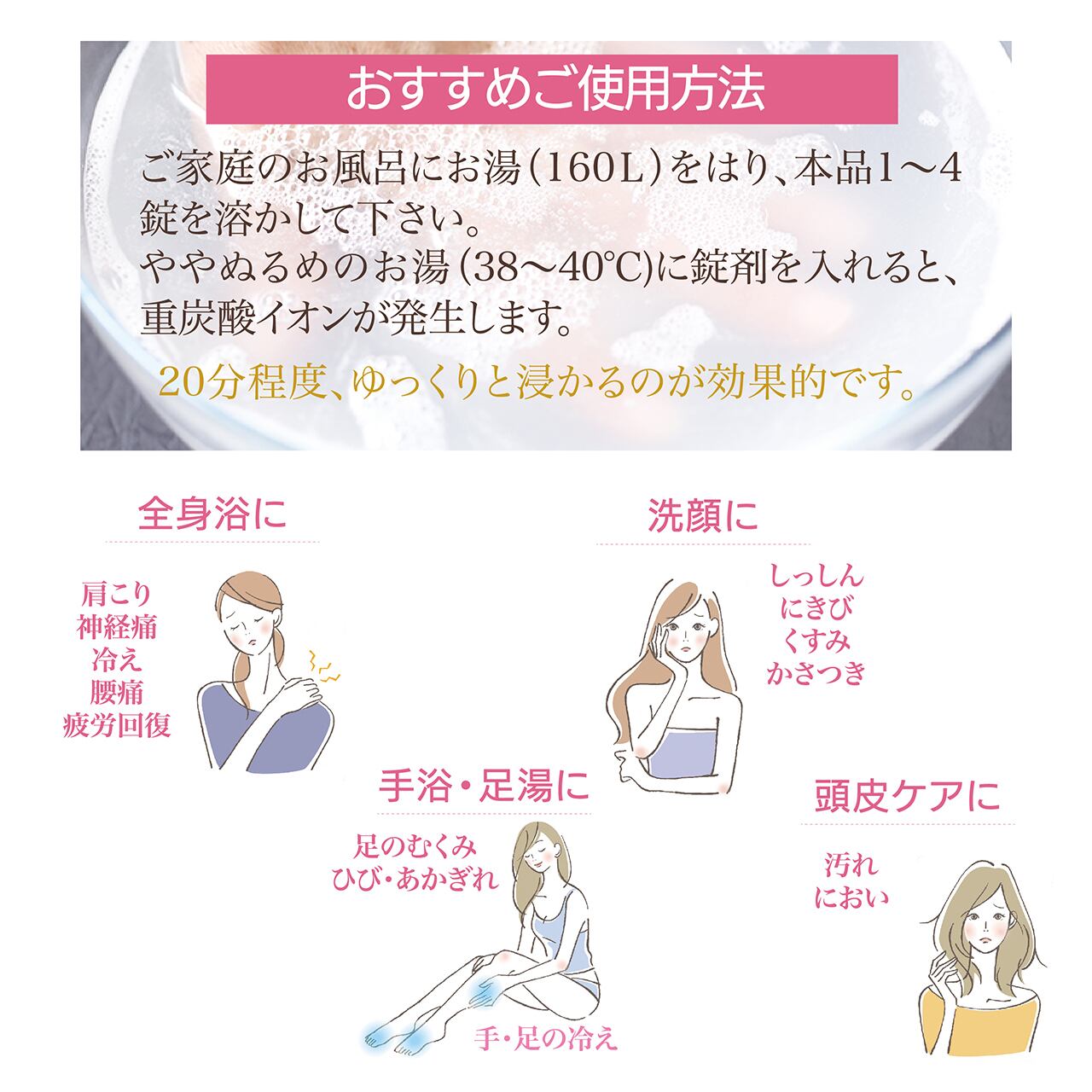 ややぬるめのお湯(38〜40℃)に錠剤を入れると、重炭酸イオンと炭酸ガスが発生します。